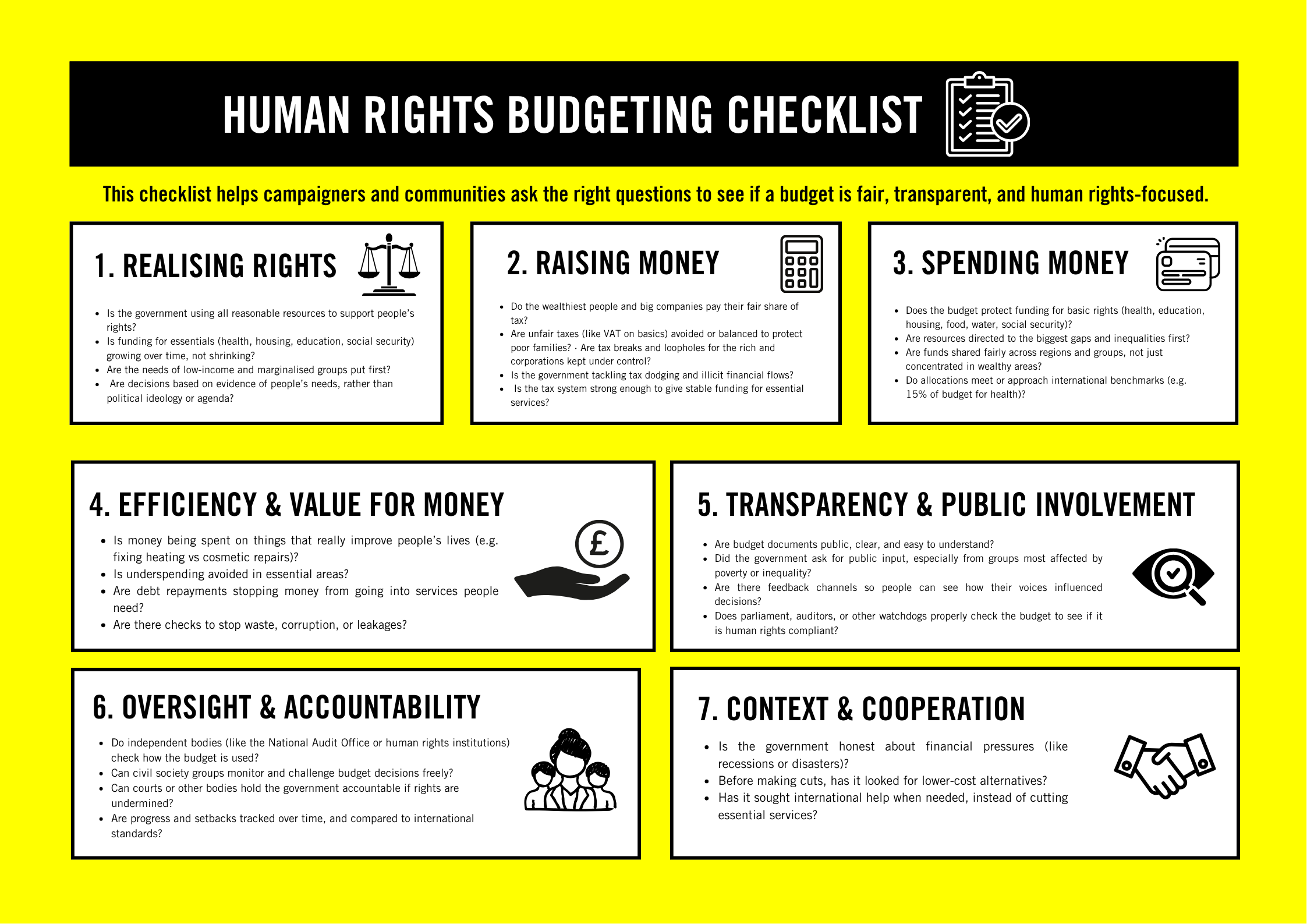 This briefing looks at how civil society, national institutions and oversight bodies can analyse and scrutinise budgets through a human-rights lens. It introduces key frameworks, such as the OPERA model, for assessing whether states use the maximum of their available resources to realise our everyday rights.