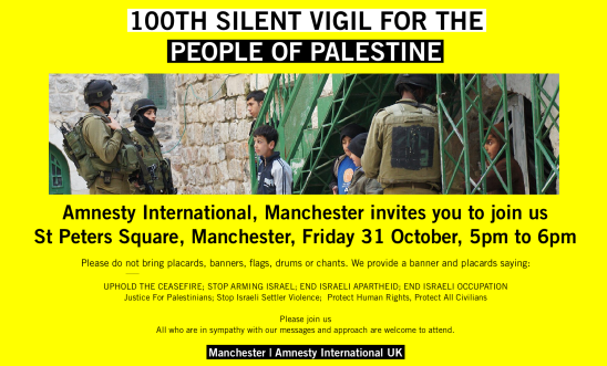 Manchester Amnesty 100th Silent Vigil for the People of Palestine, Friday, 31st October, 5-6pm