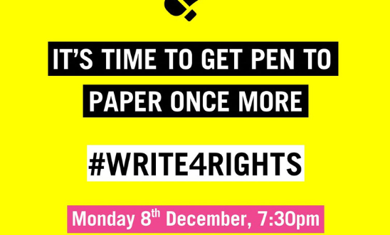 All are welcome to the Amnesty International Write 4 Rights event where you can help us by writing letters to victims of Human Rights abuses in exchange for a glass of wine and a mince pie.