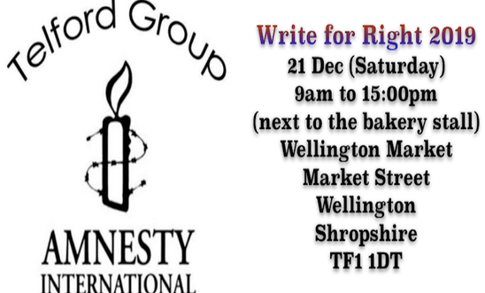 The Amnesty International Telford Group will be organizing 2019 Write for Rights at the Wellington Market TF1 1DT (Shropshire).